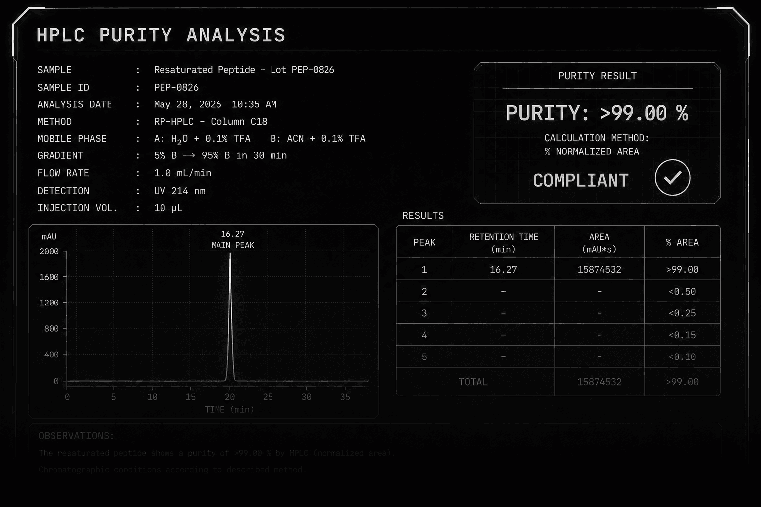 Se utilizan péptidos bioactivos seleccionados por su capacidad de interactuar con funciones fisiológicas específicas, con niveles de pureza iguales o superiores al 99% y bajo estrictos estándares de trazabilidad. Cada lote es evaluado mediante análisis independientes por laboratorios externos, asegurando consistencia y confiabilidad en cada aplicación.